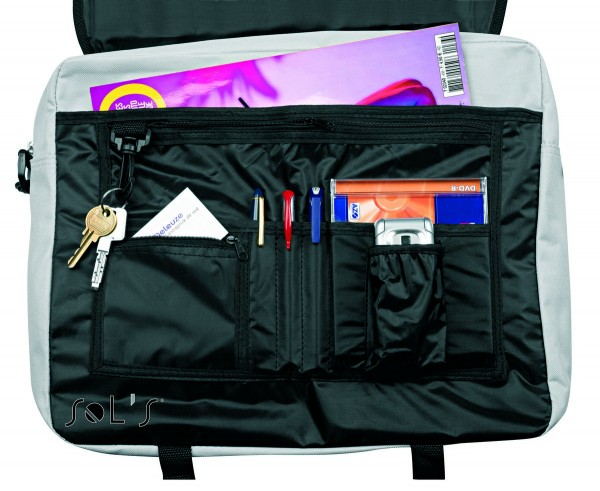 Вместительное центральное отделение с застежкой на молнии - на клапане карман на молнии - застежки в виде литых пластиковых защелок - под клапаном большой карман на молнии и множество кармашков с кантами - ячейки для ручек - маленький карман на молнии - карман для мобильного телефона - резиновая ручка с усилением из нейлона по всей длине - съемный и регулируемый ремень для ношения на плече.