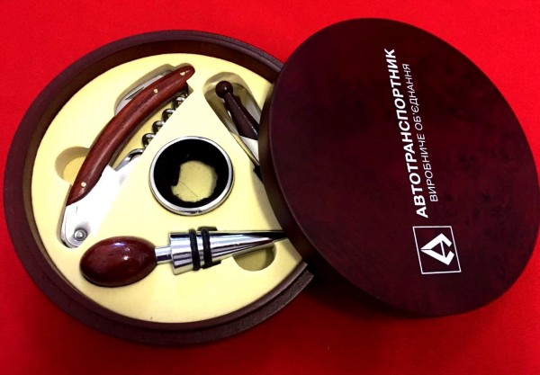 Сувенирный набор винных аксессуаров в деревянном футляре с фирменным нанесением